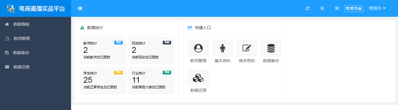 1)數據統計:班級統計、學生統計、學生審核統計、音視頻統計、案例統計、圖片統計、店鋪統計、商品統計;