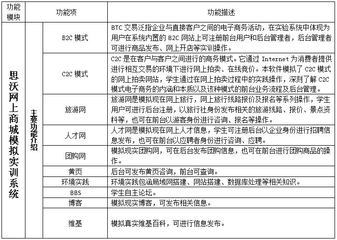思沃網(wang)上商城模擬(ni)實訓(xun)系(xi)(xi)統(tong)充分考慮到了試驗(yan)的(de)具體情(qing)況,系(xi)(xi)統(tong)針對(dui)網(wang)上商城模擬(ni)實訓(xun)進行(xing)相關(guan)配置,學生可(ke)在系(xi)(xi)統(tong)中(zhong)體驗(yan)網(wang)上B2C、C2C模擬(ni)商城開店實訓(xun)并結合(he)網(wang)絡環境的(de)搭建、數據庫運用知識、團購網(wang)、在線(xian)旅游網(wang)、在線(xian)人才(cai)網(wang)等進行(xing)多(duo)元性的(de)實訓(xun)系(xi)(xi)統(tong)。