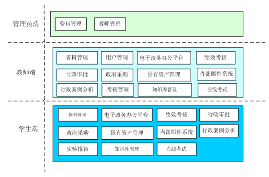 本(ben)教(jiao)學(xue)(xue)平臺軟件以模擬(ni)學(xue)(xue)生在行政單位中的(de)(de)各(ge)種業(ye)(ye)務,運用信息化建設環境(jing)下的(de)(de)各(ge)種角(jiao)色、功能配置,以各(ge)業(ye)(ye)務關系和(he)流程作(zuo)為主要實(shi)踐(jian)教(jiao)學(xue)(xue)的(de)(de)手段,配以教(jiao)師強大的(de)(de)后臺管理(li)功能和(he)教(jiao)學(xue)(xue)工具(ju),滿足(zu)電子政務及相關學(xue)(xue)科的(de)(de)教(jiao)師運用現代(dai)化教(jiao)學(xue)(xue)工具(ju)開(kai)展網絡(luo)教(jiao)學(xue)(xue)和(he)實(shi)踐(jian)教(jiao)學(xue)(xue)的(de)(de)要求。