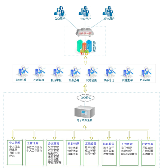 電子(zi)政務(wu)辦(ban)公平(ping)臺包(bao)括電子(zi)政務(wu)辦(ban)公系(xi)(xi)統和電子(zi)政務(wu)網站兩部(bu)分,其中電子(zi)政務(wu)辦(ban)公系(xi)(xi)統又包(bao)括:個(ge)人助理、日常(chang)工(gong)作、公文交(jiao)流、檔案管(guan)理、行政事(shi)務(wu)、人力(li)資(zi)源(yuan)、信息服務(wu)、系(xi)(xi)統設(she)置八大(da)主要功能模塊。