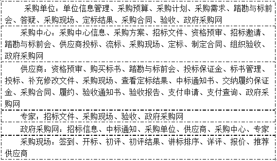 采(cai)(cai)(cai)(cai)(cai)購(gou)(gou)活(huo)動由(you)采(cai)(cai)(cai)(cai)(cai)購(gou)(gou)單位發(fa)起(qi),根(gen)據采(cai)(cai)(cai)(cai)(cai)購(gou)(gou)目錄制定采(cai)(cai)(cai)(cai)(cai)購(gou)(gou)預算、采(cai)(cai)(cai)(cai)(cai)購(gou)(gou)計劃、采(cai)(cai)(cai)(cai)(cai)購(gou)(gou)需求建立采(cai)(cai)(cai)(cai)(cai)購(gou)(gou)任務(wu)。由(you)采(cai)(cai)(cai)(cai)(cai)購(gou)(gou)中心組織并發(fa)布采(cai)(cai)(cai)(cai)(cai)購(gou)(gou)信(xin)息,供應(ying)商通過采(cai)(cai)(cai)(cai)(cai)購(gou)(gou)信(xin)息前(qian)來(lai)購(gou)(gou)買標(biao)書、制作(zuo)采(cai)(cai)(cai)(cai)(cai)購(gou)(gou)響應(ying)文(wen)件、投(tou)遞標(biao)書、交納保證金、參加標(biao)前(qian)會和踏勘、開標(biao)前(qian)提交質疑文(wen)件。