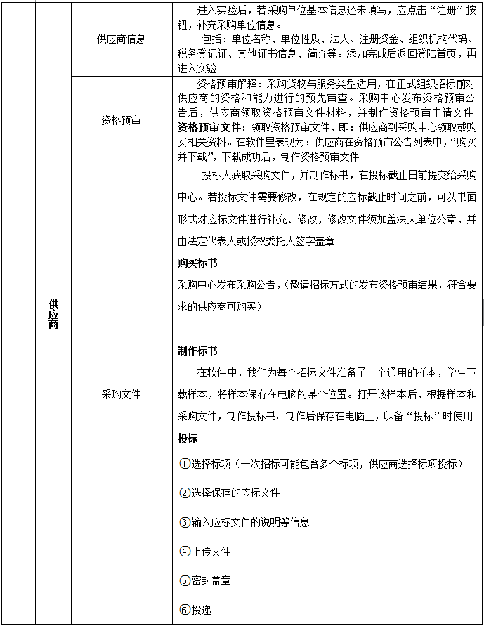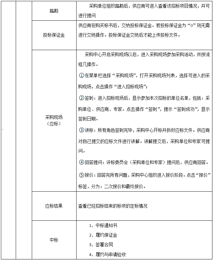 供應商信息、資格預審、采購文件、踏(ta)勘(kan)、投標保證金、采購現(xian)場(應標)、應標結果、中(zhong)標、驗收(shou)、支付