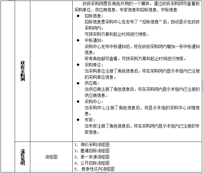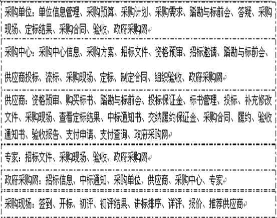 7、政(zheng)府采購網:各角色共(gong)用的一個(ge)模塊。通(tong)過政(zheng)府采購網可查看到采購單位、供應商信(xin)(xin)息、專家信(xin)(xin)息和(he)招標信(xin)(xin)息、中(zhong)標信(xin)(xin)息。