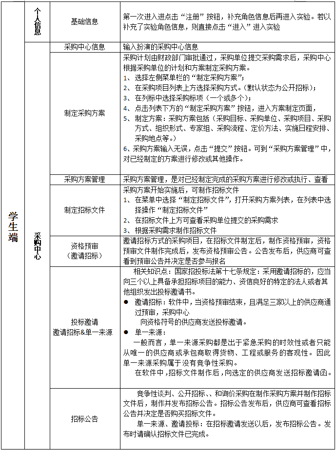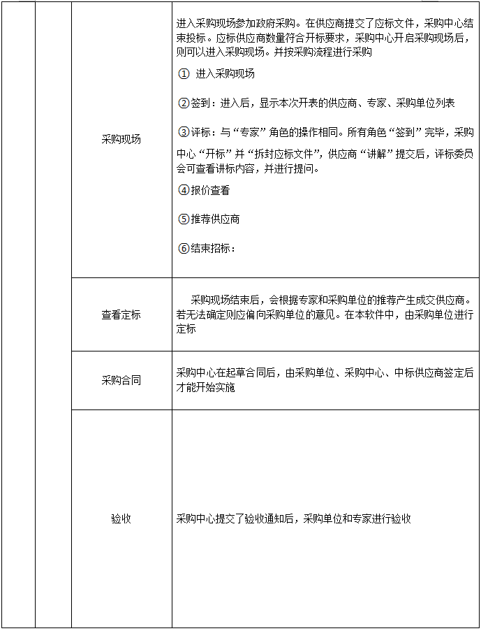 采購(gou)中心信息、制(zhi)定采購(gou)方(fang)(fang)案、采購(gou)方(fang)(fang)案管理制(zhi)定招(zhao)標(biao)文件、資(zi)格預審(邀(yao)請(qing)(qing)招(zhao)標(biao))、投(tou)標(biao)邀(yao)請(qing)(qing)、邀(yao)請(qing)(qing)招(zhao)標(biao)&單一來源、招(zhao)標(biao)公告、踏勘與(yu)標(biao)前(qian)會、查看供應商投(tou)標(biao)、(結束投(tou)標(biao))查看流標(biao)、采購(gou)現場、定標(biao)、制(zhi)定合同、組(zu)織驗收