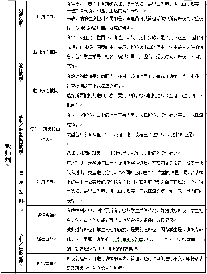 2.權(quan)限(xian)(xian)分為管(guan)(guan)理員、教(jiao)師(shi)和學(xue)生,其(qi)中學(xue)生端在首頁以出口(kou)流(liu)程(cheng)、進(jin)口(kou)流(liu)程(cheng)、資費信息、幫助(zhu)、注(zhu)冊等模塊顯示。教(jiao)師(shi)通過兩個權(quan)限(xian)(xian)對用戶、實驗基礎(chu)數據(ju)、實驗進(jin)程(cheng)等方面進(jin)行(xing)有效的(de)管(guan)(guan)理。教(jiao)師(shi)通過系統中的(de)獨(du)立(li)端口(kou)對班級(ji)學(xue)生進(jin)行(xing)管(guan)(guan)理,可對學(xue)生所需實驗步驟進(jin)行(xing)分步開放操(cao)作(zuo)權(quan)限(xian)(xian)。教(jiao)師(shi)也可根據(ju)自己(ji)所總結(jie)的(de)案例或者典型(xing)的(de)案例在管(guan)(guan)理員端口(kou)進(jin)行(xing)添加,操(cao)作(zuo)簡單(dan)、方便。