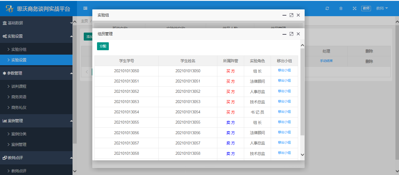 教師端包括(kuo):基(ji)礎數據(班級管(guan)(guan)理(li)、學生管(guan)(guan)理(li)、郵(you)件管(guan)(guan)理(li));實(shi)驗(yan)設置(實(shi)驗(yan)分(fen)組、實(shi)驗(yan)設置);參數管(guan)(guan)理(li)(談判課程、商務英語、商務禮(li)儀);案(an)(an)例管(guan)(guan)理(li)(案(an)(an)例分(fen)類、案(an)(an)例管(guan)(guan)理(li));教師點評(ping)(ping)(教師點評(ping)(ping)、教師點評(ping)(ping)庫、視頻回放、談判得分(fen))。