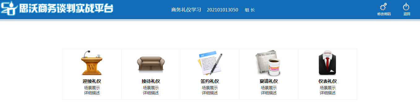思沃(wo)國際商務談判(pan)實訓平臺(tai)系統采(cai)用了(le)源于國外知名商學(xue)院的商務談判(pan)經典案(an)例素材,結合近10年來(lai)應用于中國學(xue)生的教(jiao)學(xue)實踐經驗加以(yi)修訂和(he)(he)完(wan)善,形成了(le)與(yu)教(jiao)學(xue)課件(jian)內(nei)容和(he)(he)進(jin)程相配(pei)合的7個模擬談判(pan)實踐單元。