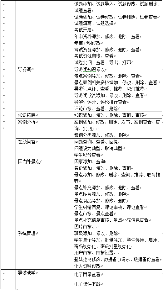 教師主要功(gong)能(neng)包括班級學生管(guan)理(li)、導(dao)游基礎(chu)知(zhi)(zhi)識管(guan)理(li)、國(guo)內(nei)導(dao)游知(zhi)(zhi)識管(guan)理(li)、國(guo)外(wai)導(dao)游知(zhi)(zhi)識管(guan)理(li)、情景(jing)題目管(guan)理(li)、導(dao)游證考試資料管(guan)理(li)、模擬考試、導(dao)游詞管(guan)理(li)、導(dao)游案例(li)管(guan)理(li)、知(zhi)(zhi)識拓展(zhan)、案例(li)分析管(guan)理(li)、在線(xian)問答、國(guo)內(nei)外(wai)景(jing)點信息管(guan)理(li)等(deng)。