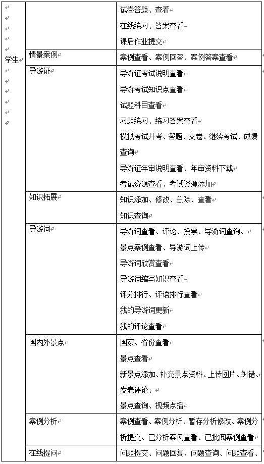 學(xue)生(sheng)的(de)(de)(de)主要功能是導(dao)游(you)教學(xue)知(zhi)識(shi)的(de)(de)(de)學(xue)習(xi)、完成(cheng)情(qing)景推理中包含的(de)(de)(de)案例及(ji)題目(mu)、導(dao)游(you)證考試(shi)學(xue)習(xi)及(ji)模擬考試(shi)、導(dao)游(you)拓展(zhan)知(zhi)識(shi)學(xue)習(xi),同時可添加新的(de)(de)(de)知(zhi)識(shi)供(gong)其他(ta)同學(xue)學(xue)習(xi)、導(dao)游(you)詞學(xue)習(xi)并編寫導(dao)游(you)詞、國內(nei)外景點學(xue)習(xi)、案例分析和在線(xian)提(ti)問。
