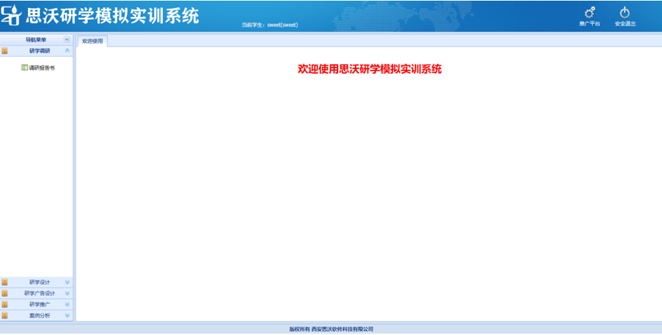 思沃(wo)研(yan)(yan)學(xue)(xue)(xue)(xue)(xue)模(mo)擬(ni)實訓(xun)系(xi)(xi)統分(fen)為管理(li)員,教師,學(xue)(xue)(xue)(xue)(xue)生(sheng)三種角色,功能包括推廣(guang)平臺、首頁,知(zhi)識庫(ku),研(yan)(yan)學(xue)(xue)(xue)(xue)(xue)推廣(guang),圖文結合廣(guang)告(gao),媒體推送廣(guang)告(gao),研(yan)(yan)學(xue)(xue)(xue)(xue)(xue)調研(yan)(yan),研(yan)(yan)學(xue)(xue)(xue)(xue)(xue)設(she)計(ji)等(deng)。學(xue)(xue)(xue)(xue)(xue)生(sheng)通過模(mo)擬(ni)實訓(xun)體驗(yan)從研(yan)(yan)學(xue)(xue)(xue)(xue)(xue)內容調研(yan)(yan)、研(yan)(yan)學(xue)(xue)(xue)(xue)(xue)路線設(she)計(ji)、研(yan)(yan)學(xue)(xue)(xue)(xue)(xue)核心價(jia)值發掘(jue)、研(yan)(yan)學(xue)(xue)(xue)(xue)(xue)媒體網絡(luo)推廣(guang)等(deng)一系(xi)(xi)列工作內容。 研(yan)(yan)學(xue)(xue)(xue)(xue)(xue)軟件包含(han)案例分(fen)析,點評(ping),研(yan)(yan)學(xue)(xue)(xue)(xue)(xue)線路設(she)計(ji),團隊類型,機型,小交通標準(zhun)(zhun),出(chu)入境(jing)口岸,匯率維護,酒店(dian)類型,研(yan)(yan)學(xue)(xue)(xue)(xue)(xue)類型知(zhi)識庫(ku)類型,案例類型,航空(kong)公司(si),線路區域(yu),團隊等(deng)級(ji),住宿標準(zhun)(zhun),大交通標準(zhun)(zhun),門票標準(zhun)(zhun),餐飲標準(zhun)(zhun),導游(you)證類別,酒店(dian)等(deng)級(ji),客戶行(xing)(xing)業分(fen)類,客戶等(deng)級(ji)分(fen)類,客戶關(guan)系(xi)(xi)深度(du),地接車等(deng)級(ji),客戶接受程度(du),國(guo)家維護,省份維護,城市維護,景點類型,學(xue)(xue)(xue)(xue)(xue)生(sheng)可以進行(xing)(xing)系(xi)(xi)統的模(mo)擬(ni)學(xue)(xue)(xue)(xue)(xue)習(xi)。