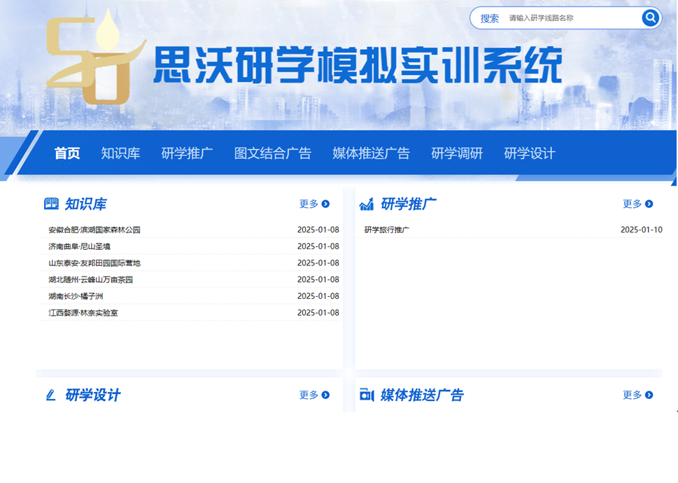 推(tui)廣平(ping)臺包括首頁,知識庫,研(yan)學推(tui)廣,圖文(wen)結合廣告(gao),媒體推(tui)送廣告(gao),研(yan)學調研(yan),研(yan)學設計(ji)等(deng)模塊。