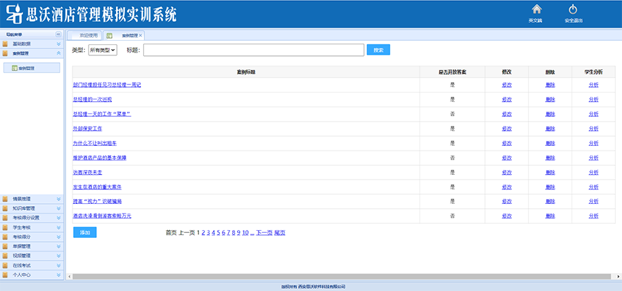 案例分析:提供(gong)豐(feng)富多樣的專業實訓(xun)案例(li)(li)任務,數(shu)量不少于200個。案例(li)(li)涵蓋酒店運營過程中的各(ge)種常(chang)見場(chang)景與(yu)突發問(wen)題(ti),如(ru)客戶投訴(su)處理(li)、特(te)殊訂單安排(pai)、資源調配難題(ti)等(deng),幫助學(xue)生(sheng)將理(li)論知識應(ying)用于實際(ji)情境,培養學(xue)生(sheng)分析問(wen)題(ti)與(yu)解決(jue)問(wen)題(ti)的能力(li)。?