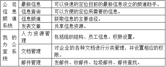 你(ni)可(ke)(ke)以(yi)向公共(gong)信息欄內發布新聞、通知(zhi)……其(qi)他用戶可(ke)(ke)及(ji)時瀏覽最(zui)新信息。“我的(de)辦(ban)(ban)公室”模(mo)塊(kuai),你(ni)可(ke)(ke)以(yi)輕松管理各類型文(wen)檔資料;郵件(jian)系(xi)統(tong)方(fang)便(bian)了與其(qi)他人員(yuan)的(de)聯(lian)系(xi);公文(wen)辦(ban)(ban)理是辦(ban)(ban)公系(xi)統(tong)的(de)重點,公文(wen)審批流(liu)(liu)程將在此進行(xing);通訊錄讓你(ni)輕松查閱(yue)需(xu)要的(de)聯(lian)系(xi)方(fang)式。“日志任務”模(mo)塊(kuai)是個人事務計劃和(he)實施的(de)小秘書,提醒(xing)你(ni)待辦(ban)(ban)公文(wen)和(he)待辦(ban)(ban)事件(jian)。你(ni)可(ke)(ke)以(yi)在線與其(qi)他成員(yuan)交流(liu)(liu),或者進行(xing)網(wang)絡會議、在線投票及(ji)自由(you)討(tao)論。