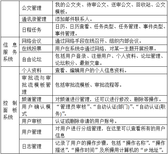你(ni)可(ke)以向公(gong)(gong)(gong)(gong)共信息欄內發布新(xin)聞、通知……其他用(yong)戶可(ke)及時(shi)瀏覽最新(xin)信息。“我(wo)的辦(ban)公(gong)(gong)(gong)(gong)室”模塊(kuai),你(ni)可(ke)以輕松(song)管理各(ge)類型文檔(dang)資(zi)料;郵件系(xi)統方(fang)便(bian)了與其他人員(yuan)的聯(lian)系(xi);公(gong)(gong)(gong)(gong)文辦(ban)理是辦(ban)公(gong)(gong)(gong)(gong)系(xi)統的重(zhong)點,公(gong)(gong)(gong)(gong)文審批流程將在此進行;通訊錄讓你(ni)輕松(song)查閱(yue)需要(yao)的聯(lian)系(xi)方(fang)式。“日志任務”模塊(kuai)是個人事(shi)務計劃和實施的小秘書(shu),提醒你(ni)待辦(ban)公(gong)(gong)(gong)(gong)文和待辦(ban)事(shi)件。你(ni)可(ke)以在線與其他成員(yuan)交流,或者進行網絡會(hui)議、在線投(tou)票(piao)及自由(you)討論。
