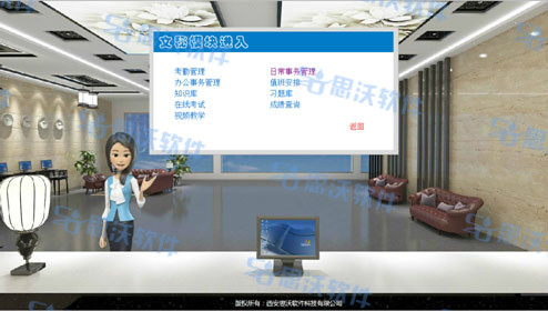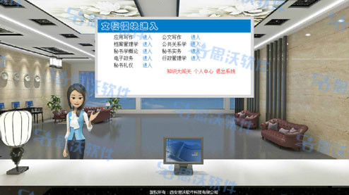 思沃(wo)文(wen)秘(mi)虛擬仿真實(shi)訓系統是我(wo)公司依據文(wen)秘(mi)專業相(xiang)關(guan)課程,結合3D動(dong)態場景技(ji)術,引入實(shi)際文(wen)秘(mi)工作(zuo)中(zhong)的(de)相(xiang)關(guan)案例,融合開(kai)發的(de)一款針對文(wen)秘(mi)專業實(shi)訓的(de)應用型(xing)教學(xue)平臺(tai)軟(ruan)件(jian)。